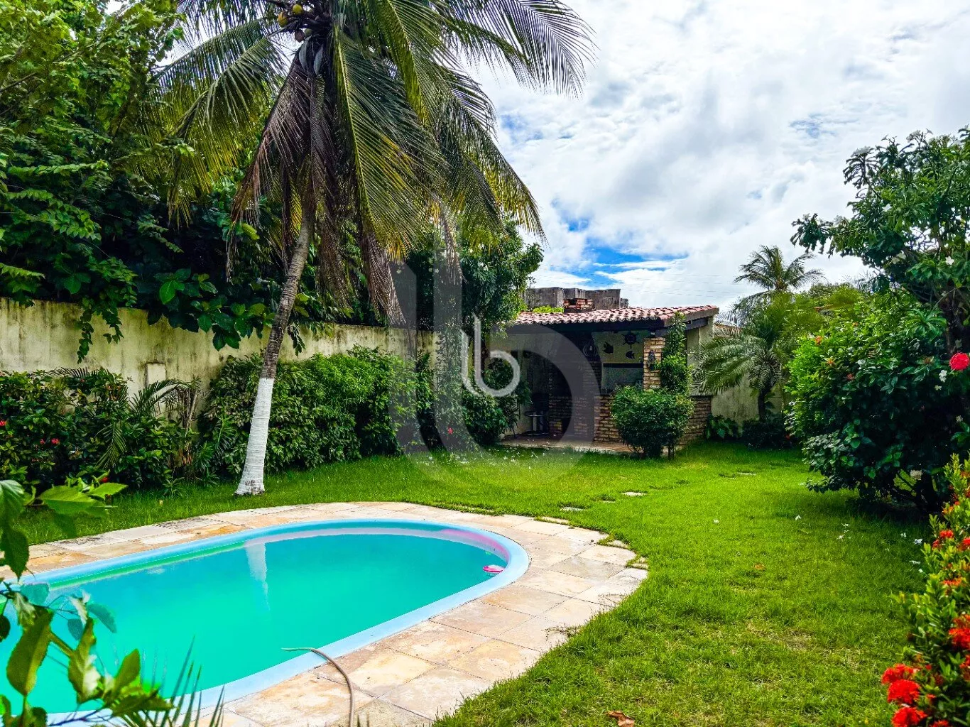 Quintal com árvores frutíferas e um belíssimo jardim